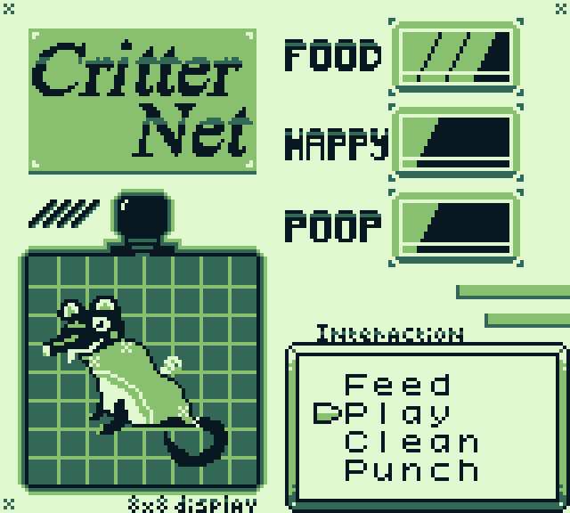 The game is a Tamagotchi-like, playable on DMG emulators. You can watch their stats lower over time and take care of them until they're back to full health.